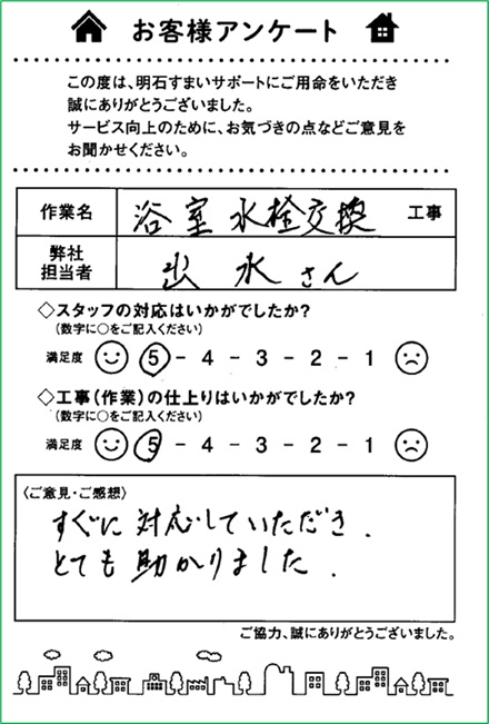 浴室水栓交換をさせていただいたお客様から貴重なお声を頂きました。 ありがとうございました。[2026年02月09日]