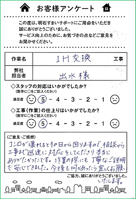 IHコンロ交換をさせていただいたお客様から貴重なお声を頂きました。 ありがとうございました。[2025年10月10日]