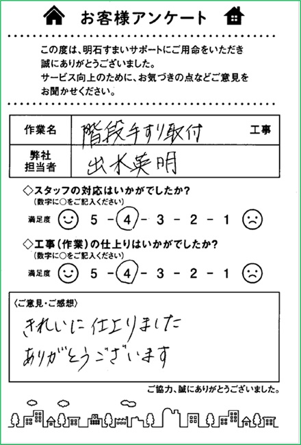 階段手摺取付工事をさせていただいたお客様から貴重なお声を頂きました。 ありがとうございました。[2025年10月14日]