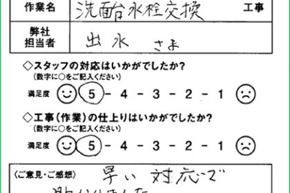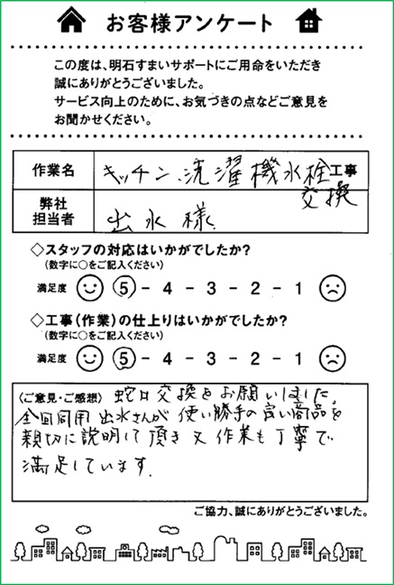 キッチン水栓交換、洗濯水栓交換をさせていただいたお客様から貴重なお声を頂きました。