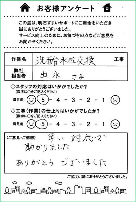 洗面水栓交換をさせていただいたお客様から貴重なお声を頂きました。                           ありがとうございました。[2025年12月09日]