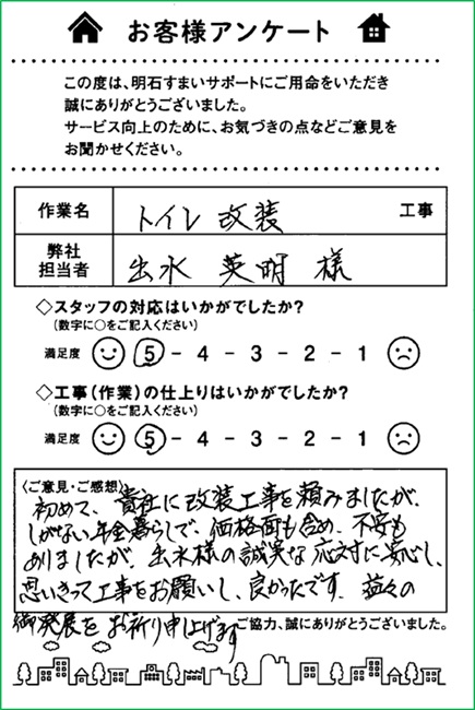 トイレリフォームをさせていただいたお客様から貴重なお声を頂きました。                         ありがとうございました。[2026年02月20日]